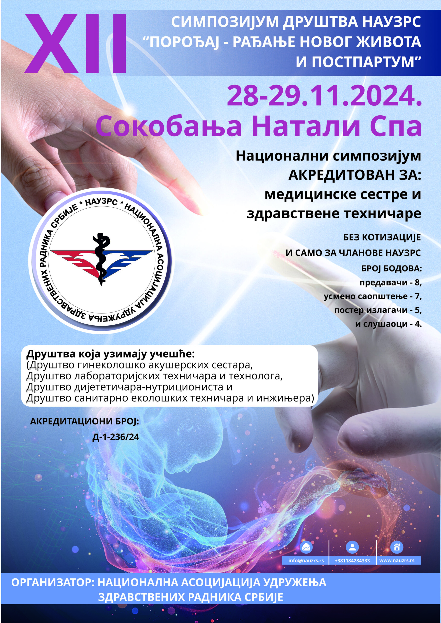 Овде можете преузети програм. Добро дошли на XII симпозијум Друштва НАУЗРС који се одржава у Сокобањи у Хотелу ”Натали Спа” у термину од 28. до 29. новембра 2024. године. Акредитациони број XII симпозијума Друштва НАУЗРС је: Д-1-236/24. Акредитован je за медицинске сестре и здравствене техничаре. ТЕМА СИМПОЗИЈУМА: “ Порађај – рађање новог живота и постпартум“ ПРЕДАВАЧИ: струк.мед.сестра – бабица Радмила […]