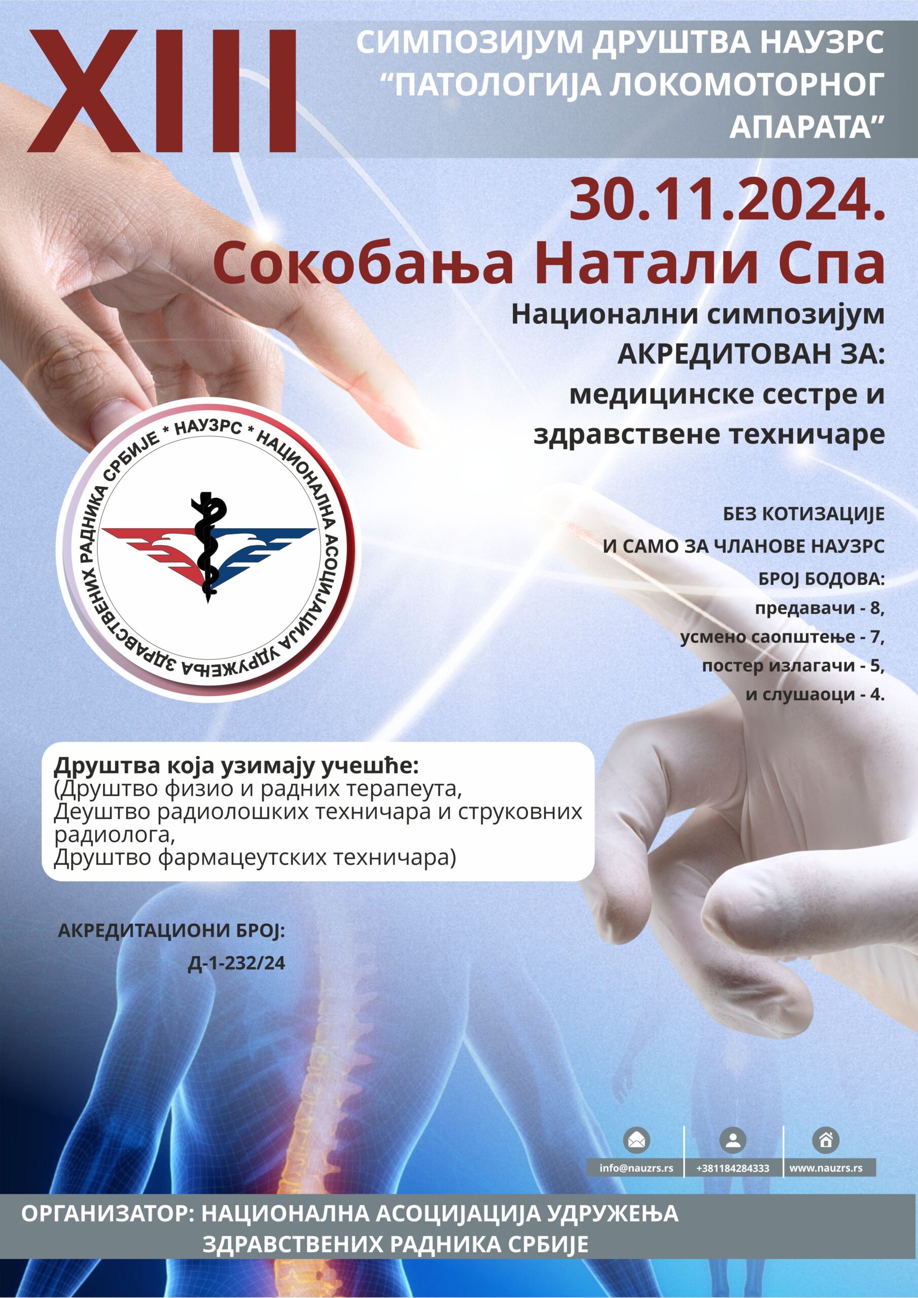 Овде можете преузети програм. Добро дошли на XIII симпозијум Друштва НАУЗРС који се одржава у Сокобањи у Хотелу ”Натали Спа” 30. новембра 2024. године. Акредитациони број XIII симпозијума Друштва НАУЗРС је: Д-1-232/24. Акредитован je за медицинске сестре и здравствене техничаре. ТЕМА СИМПОЗИЈУМА: “ Патологија локомоторног апарата „ ПРЕДАВАЧИ: струк.физиот. Александар Марић, виши струк.тех. Далибор Тонић, струк.мед.радиолог Саша Костадиновић, фарм.тех. Александра Јовановић, струк.физиот. […]