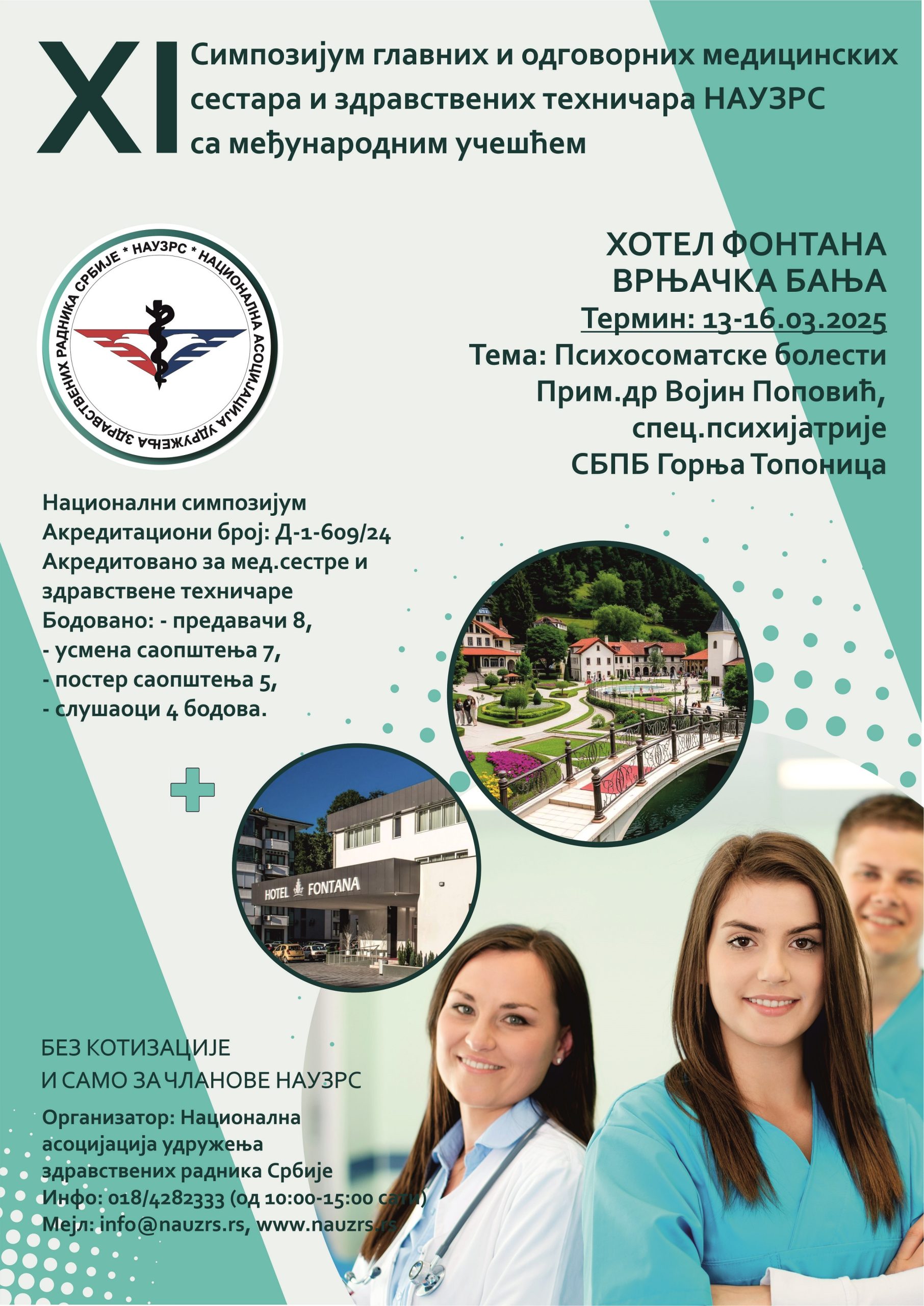 Добро дошли на XI симпозијум главних и одговорних медицинских сестара и здравствених техничара НАУЗРС са међународним учешћем који се одржава у Врњачкој Бањи у Хотелу ”Фонтана” од 13. до 16. марта 2025. године. Акредитациони број XI симпозијума главних и одговорних медицинских сестара и здравствених техничара НАУЗРС са међународним учешћем је: Д-1-609/24. Акредитован je за медицинске сестре и здравствене техничаре. ТЕМА СИМПОЗИЈУМА: “ Психосоматске болести„ […]